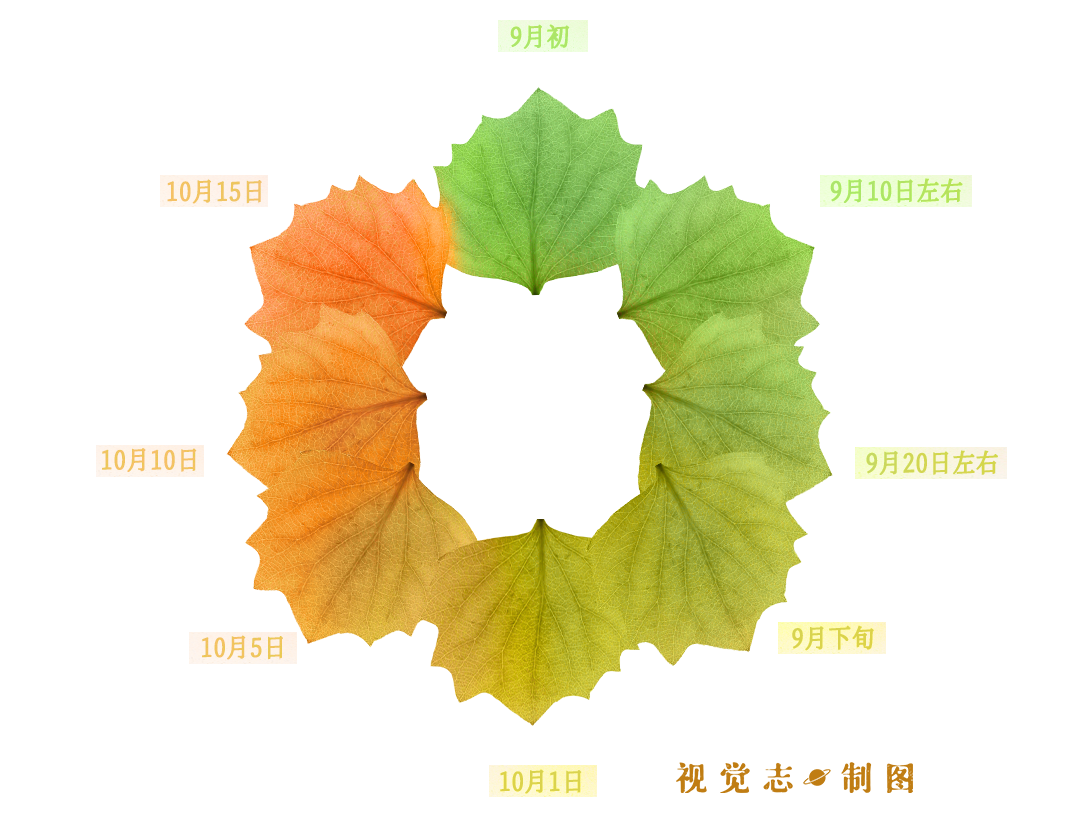 隨着氣候的轉冷,葉片中的葉綠素逐漸分解,胡蘿蔔素的含量升高,就像一個調色盤,紅色開始增加,葉片逐漸由綠色轉為半黃、淺黃、金黃到橘黃。