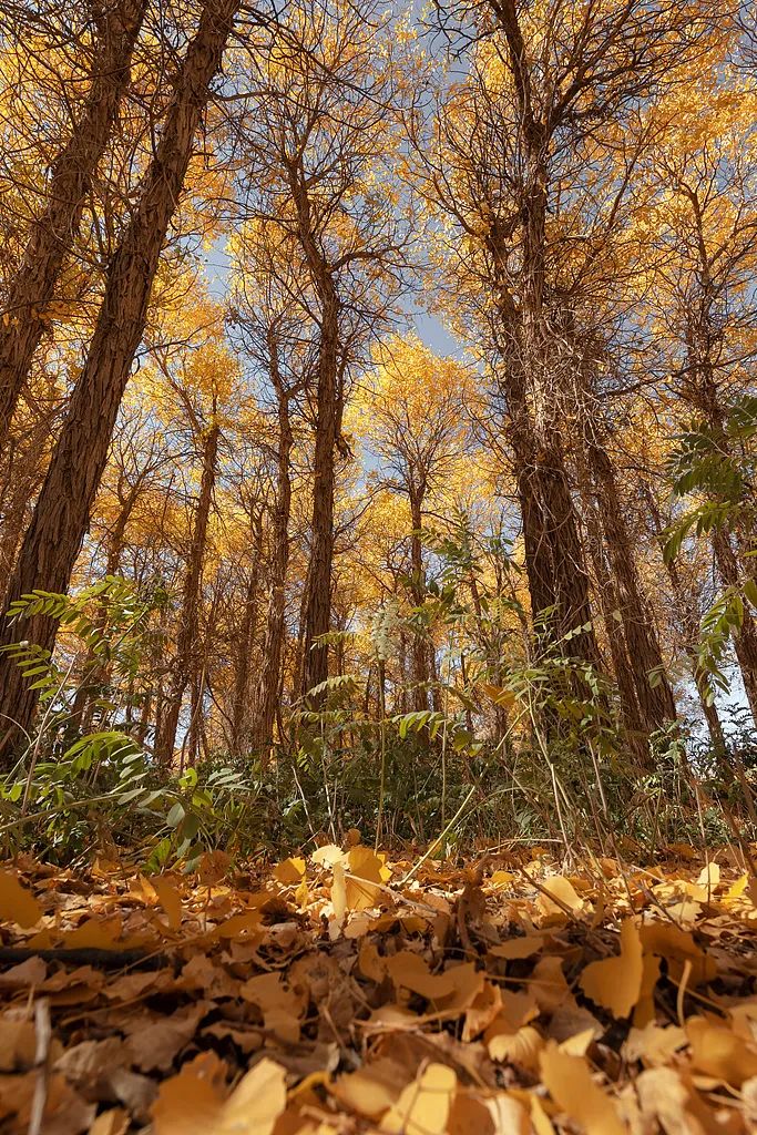 額濟納胡楊的葉片一般在9月下旬開始變色,樹冠上葉片開始逐漸變黃,緊接着不斷向下蔓延,就像換上了黃色的衣衫。