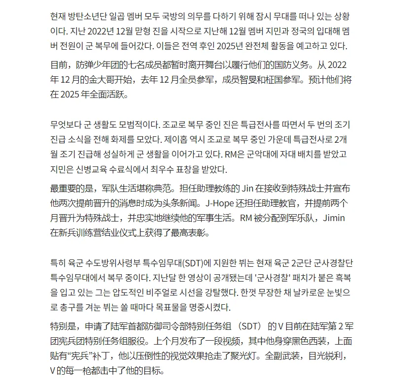 以金碩珍和鄭號錫兩人的情況為例,他們在入伍之後不久便火速通過了韓軍的“特級戰士”考核,在其他同期新兵還在苦哈哈地給老兵當牛做馬、忍受拳打腳踢的時候,他們就已經可以頂着教官的身份到老兵那桌去坐着吃飯了。而金南俊更是被直接分配到了韓軍軍樂隊,這下連日常軍訓的苦頭都不用吃了,踏踏實實待在後方,給長官們吹黑管一直吹到平安退伍就行。