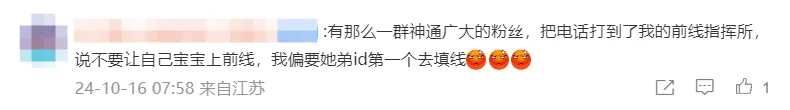 “有那麼一羣神通廣大的粉絲,把電話打到了我的前線指揮所,説不要讓自己寶寶上前線,但我偏要她的愛豆,第一個去填線!”