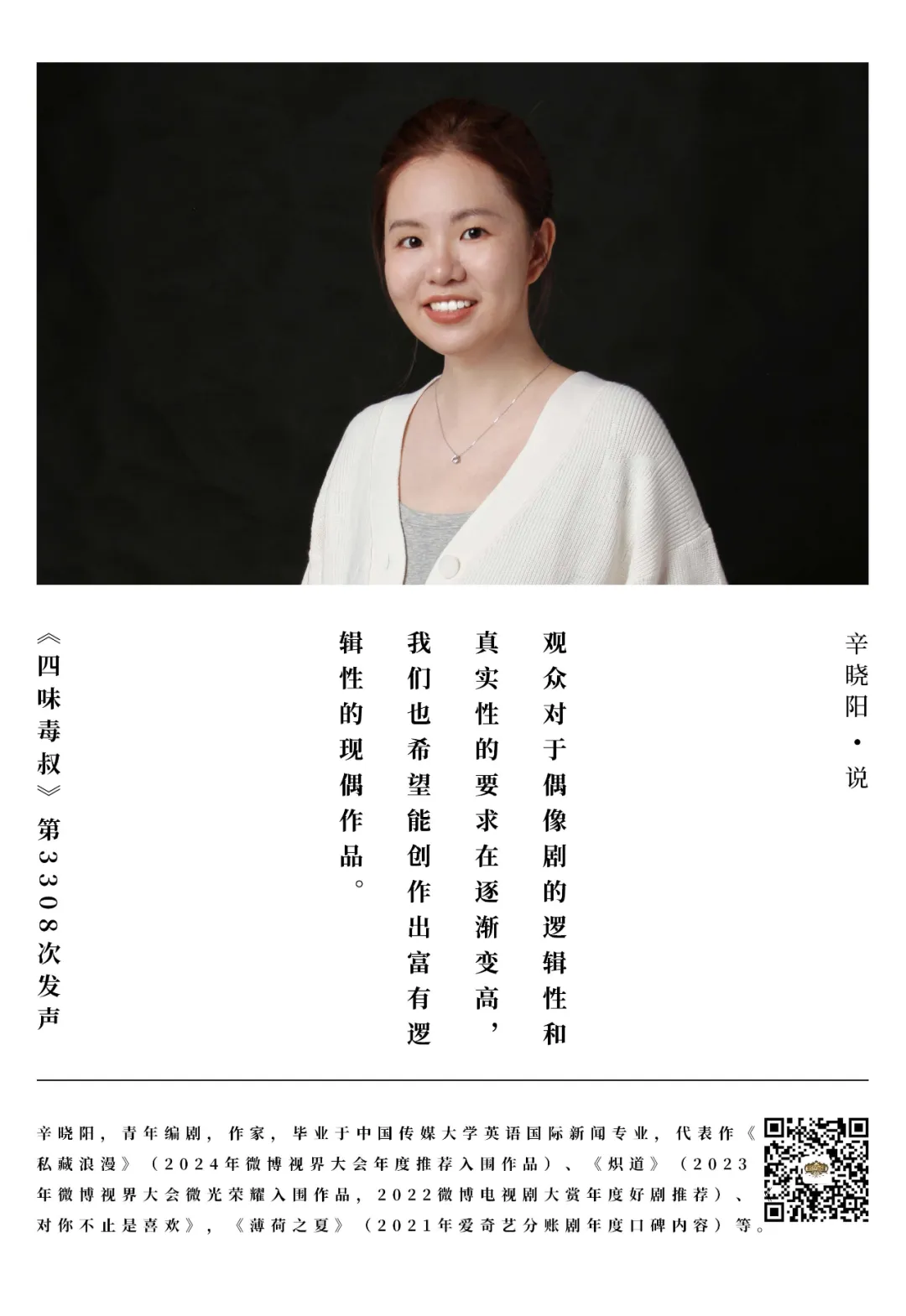 **辛曉陽:**因為我們也經常就是衝浪,天天都在刷小紅書,其實大家不太能夠接受一個比如突然之間的親吻,沒有來由的感情的遞進,或者是天光一閃,兩個人擁抱原地轉三圈這種魔幻愛情,可能現在對大家來講,就離生活有點遠了。所以我其實覺得現在現偶對編劇的要求是在不斷提高的,相應的其實也是觀眾他們對於現偶或者對於愛情的期待越來越落地了,大家會覺得在現實當中我可能生活的一些痛苦,愛情的痛苦、不如意,我需要通過電視劇去找到一個出口。