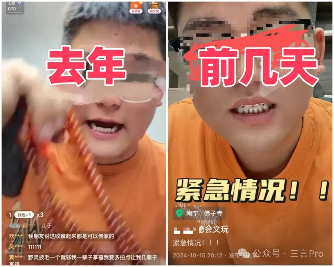 自三言曝光此類騙局已經快有1年,三言觀察到,此前我們文章中寫過的化妝假裝被老婆打的某劇本主播,還在發視頻,似乎近期仍在直播。