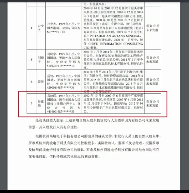 而在相關的股權説明書裏,也出現了易建聯的身份證信息,確認是1987年的無疑。