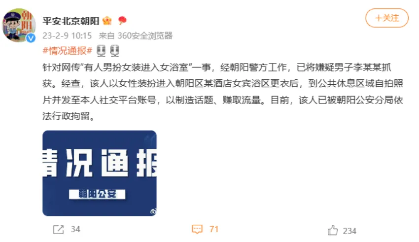 比如,穿着女裝跑去酒店女賓浴區換衣服,還公然拍照發微博,最後被行政拘留了。