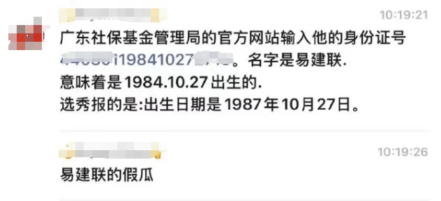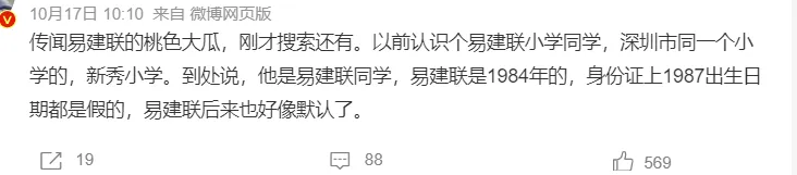 據傳,有小學同學出來闢謠,説易建聯是1984年出生,而非身份證上的1987年。