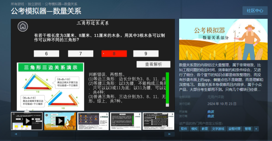 此前幾天,Steam上非常應景地出現了一款《公考模擬器-數量關係》,預計10月23日發售,初始售價58元。遊戲定位是針對“數量關係”一節提供“輔助學習”,某種程度上“降低學習難度”。