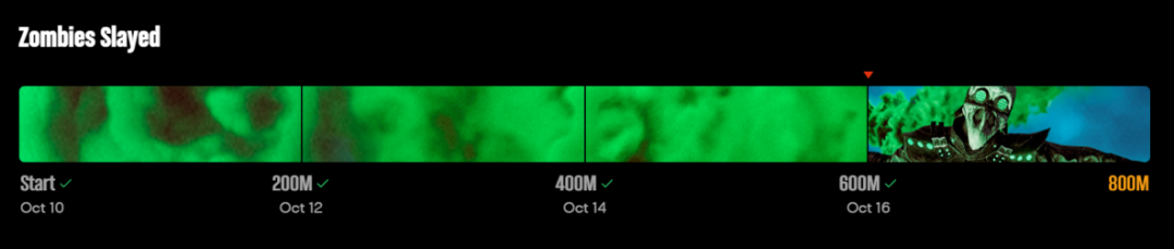 活動上線當日,R星也頒佈了一項社區挑戰。假如玩家們在10月23日前剿滅共計8千萬只喪屍,就會向所有玩家提供一套熒光骷髏連體衣和骷髏頭面具作為獎勵。