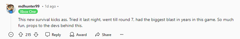 “新生存戰爽翻了……向背後的開發者致敬。”