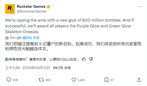 可是就在三天後,R星突然發推稱,他們要把挑戰數字加個零,變成8億——因為在他發帖時,玩家們已經屠殺了超過2億隻喪屍。當然,之前的獎勵照發,倘若新的挑戰達成,R星會同時發放熒光連體衣的換色版本。