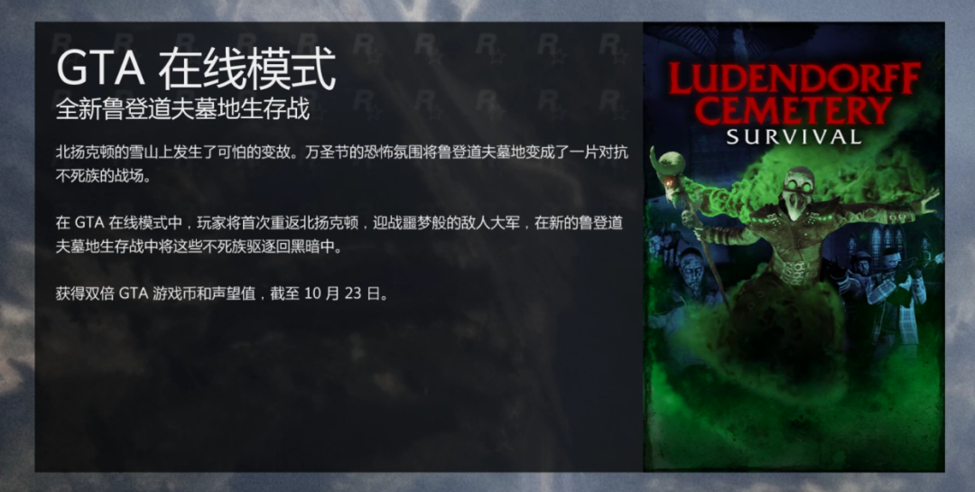 GTAV的衍生線上模式,也就是GTA Online(GTAOL),為了迎接即將到來的萬聖節,推出了一系列限時活動。其中之一是在10月10日正式上線的“魯登道夫墓地生存戰”,R星要讓玩家在這片墓地裏迎戰活死人大軍,“包括遊蕩的屍體、巨型戰士以及被附身的動物”。