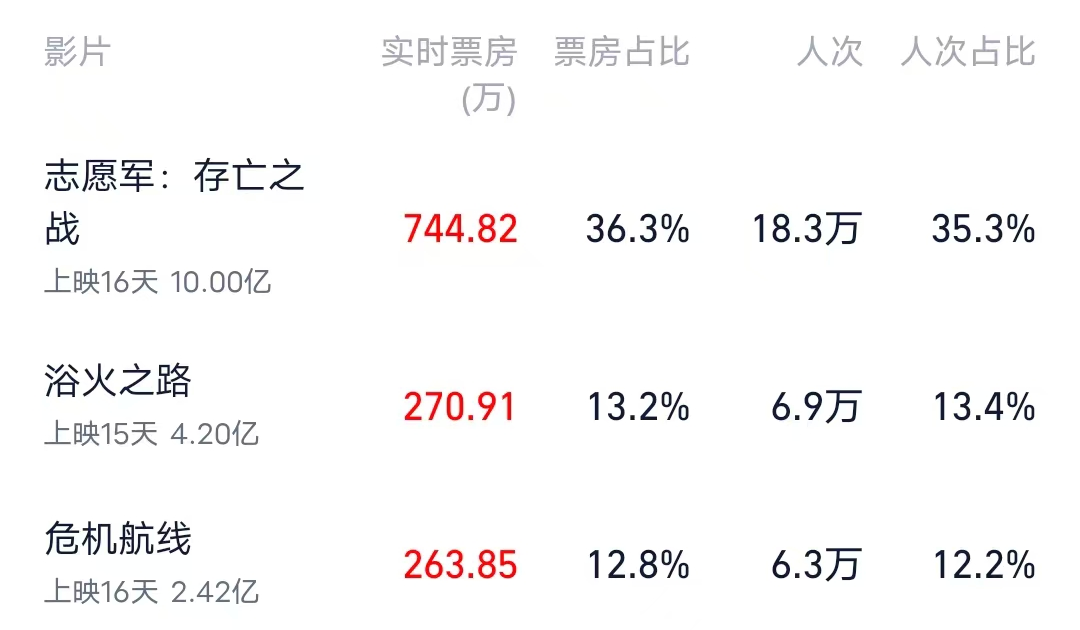 值得一提的是,《志願軍:存亡之戰》並沒有一開始就拔得頭籌,而是靠着口碑發酵一步一步追上並反超,最終以絕對的優勢與同期的影片拉開了距離。