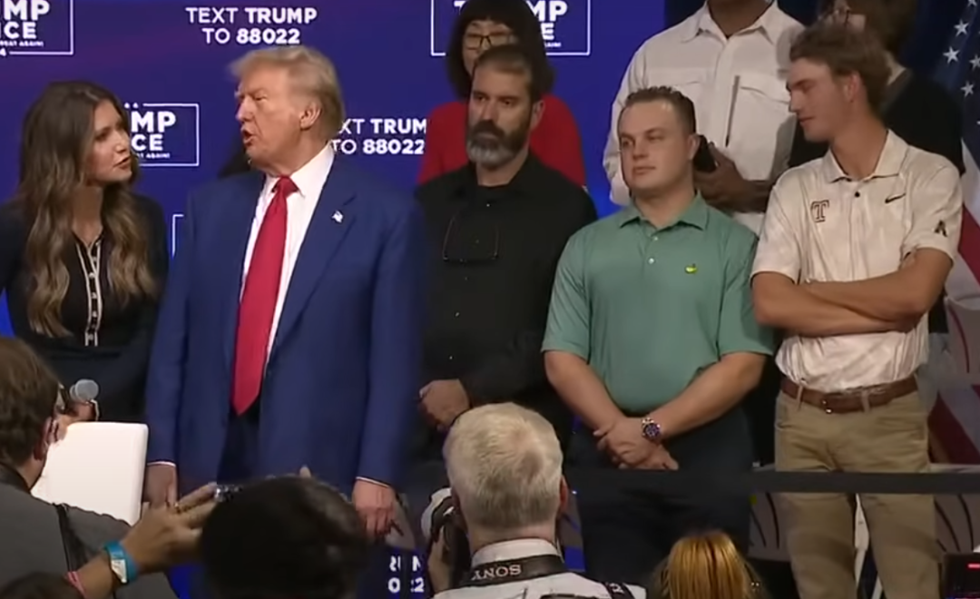 特朗普很輕鬆,很幽默。Krisit Noem説,現在經濟不好,會場都開不起空調。特朗普説,確實很熱,但自己不怕熱,熱了可以減肥,減個四、五磅。還問現場觀眾,你們還有誰要暈倒的請舉個手……
