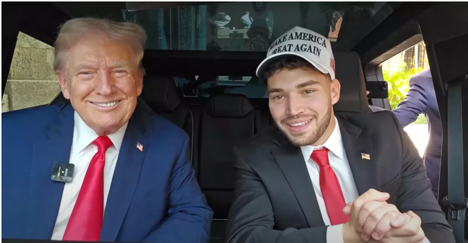 3.今年8月初,網紅Adin Ross送了特朗普一輛特斯拉的Cybertruck。一上車,這位小弟就給特朗普播放音樂。他説他從競選團隊那裏要到了特朗普的心水歌單。特朗普很高興