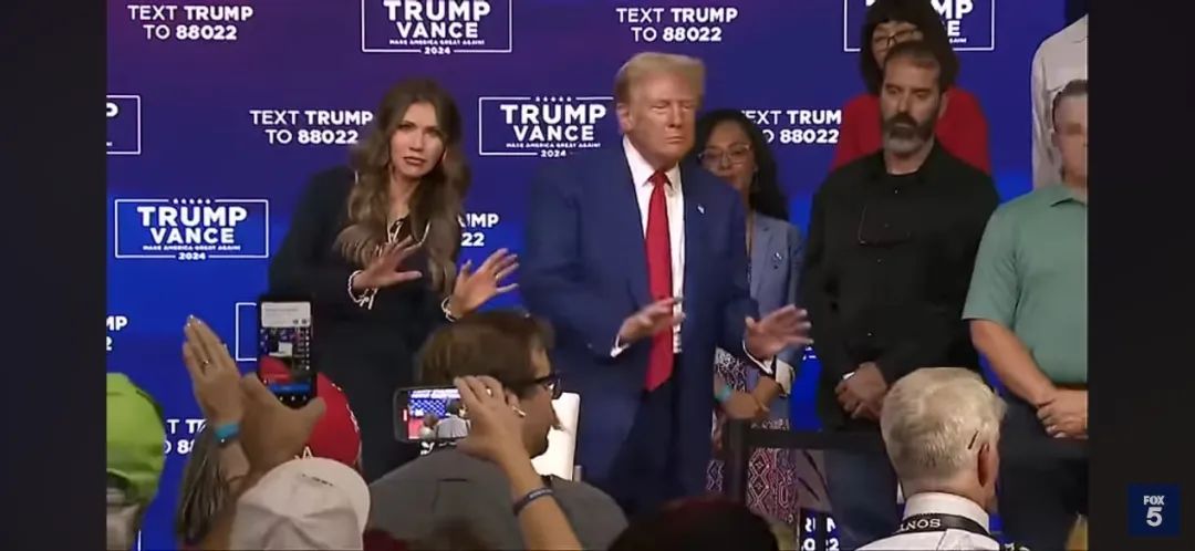 主持人南達科州州長Kristi Noem很尷尬,不知道該站着好,還是應該扭一扭。手都不知道該放哪兒了。異常尷尬。站在台上(特朗普後面)的一些現場觀眾也很尷尬。
