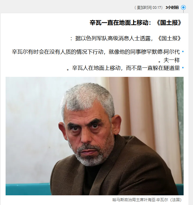 🔻以色列國防軍發言人哈加里説:“我們不知道他在那裏。起初我們發現他是其中一棟建築物內的一名武裝人員,有人看到他戴着巴勒斯坦頭巾,在被殺前向無人機扔了一塊木板。”