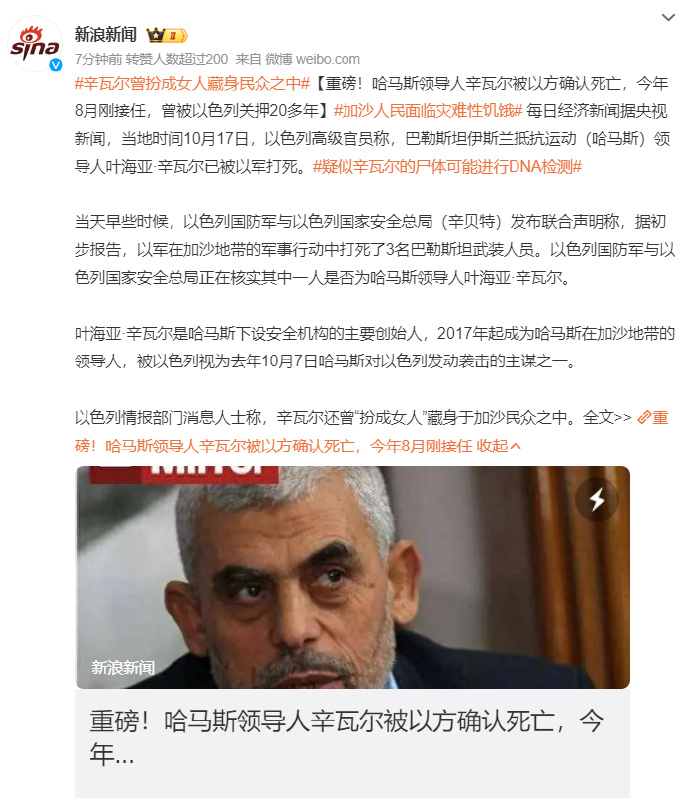 🔻以軍發佈的消息稱:以軍士兵砍下了辛瓦爾左手的食指,説是進行DNA檢驗。