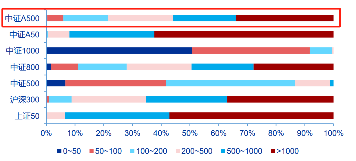 圖:與其他寬基指數對比,A500成份股自由流通市值分佈更均衡