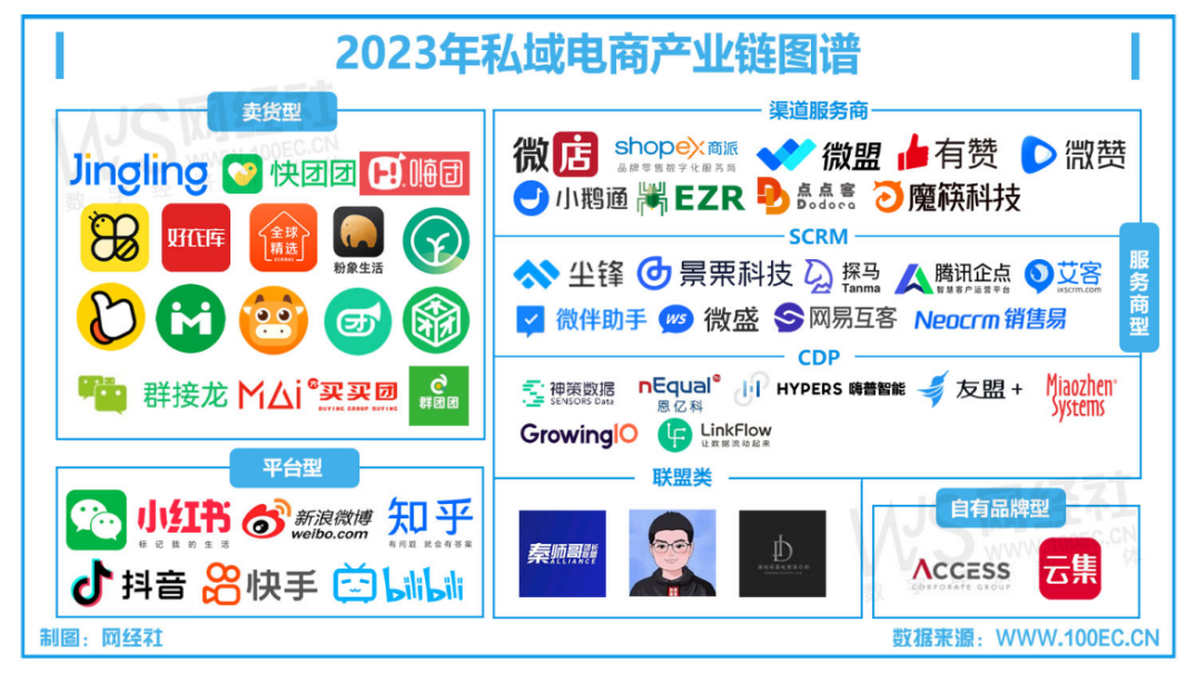 目前私域電商玩家有:1.平台型:微信、小紅書、微博、知乎等;2.賣貨型:鯨靈集團、蜂享家、好衣庫、快團團、羣接龍、啊呀團、團團團等;3.自有品牌型:ACCESS、雲集;4.服務商型:渠道服務商:微店、微盟、有贊;SCRM:塵鋒、景栗科技;CDP:神策數據、恩億科、嗨普智能;**5.聯盟類:**秦師哥團長聯盟、快團聯盟、落地母嬰等。