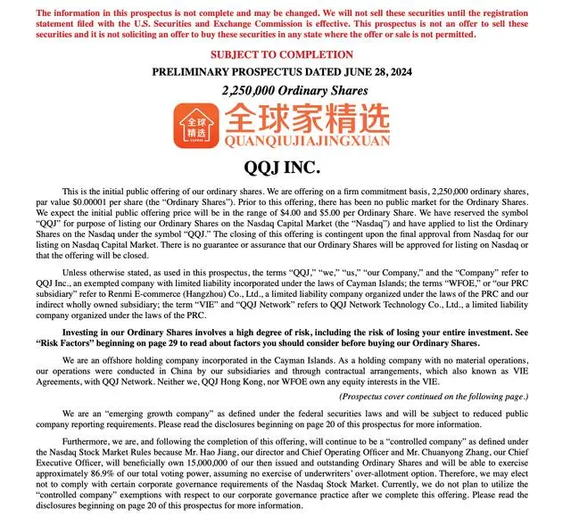 2024年6月28日,“全球家精選”公司主體杭州移動電商平台仁彌(杭州)網絡科技有限公司的開曼實控公司QQJ Inc. ——“全球家精選”向美國證券交易委員會遞交更新招股書,擬納斯達克IPO上市,預計IPO募資金額為1000萬美元。