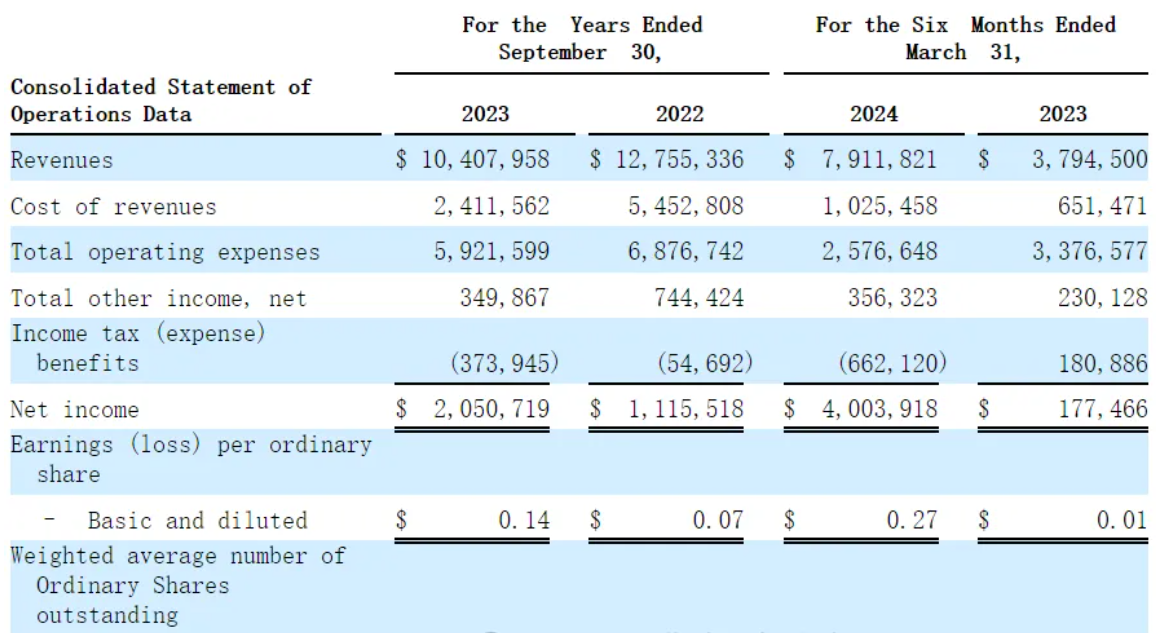 不過,截至3月31日止的2023上半財年及2024上半財年,公司分別實現營收379.5萬美元、791.2萬美元,同比增長高達109%。相應的淨利潤分別為18萬美元、400萬美元。