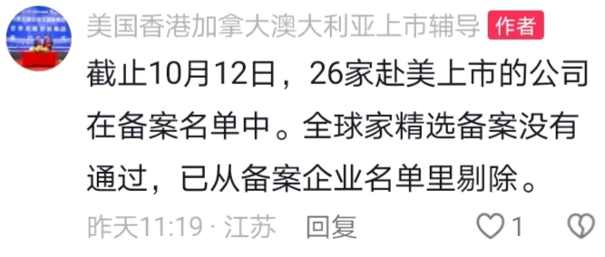 據中國證監會官網公開資料顯示,截止10月12日,26家赴美上市的公司在備案名單中,全球家精選備案沒有通過,已從備案企業名單裏剔除。這家來自杭州蕭山的S2B2C模式私域電商平台在今年2月悄悄向美國證券交易委員會提交了IPO申請,如今卻遭遇了備案未通過的困境。