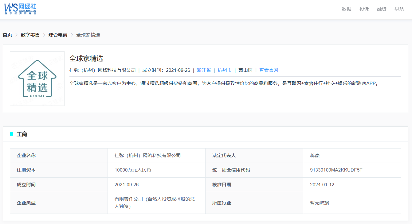 從網經社企業庫獲悉,全球家精選成立於2021年9月26日,其是一家以客户為中心、通過精選超級供應鏈和商圈,為客户提供極致性價比的商品和服務,是“互聯網+衣食住行+社交+娛樂”的新消費APP。