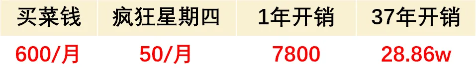 算下來一個月伙食費是650,一年伙食費才7800,**37年合計28w8600!**我之前算大餐奶茶都莽上伙食費是180w,現在一進菜市場狂省150w啊!!
