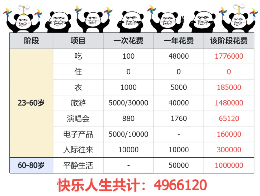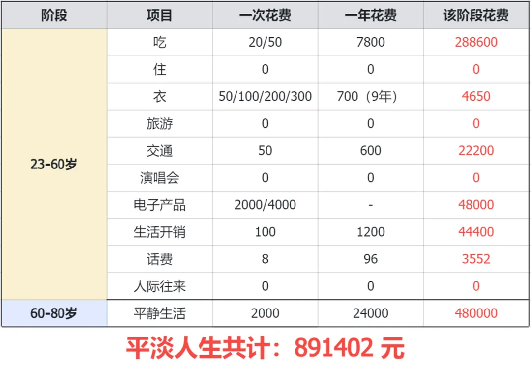 我們還是從大學畢業開始算,把人生分成兩個階段。**一是23-60歲,粗茶淡飯青春版。****二是60-80歲,平安喜樂晚年版。**看看一共要花多少錢!