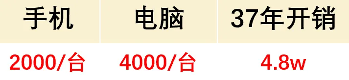 手機買2000一台的,電腦買4000的,一共是6000。我們每5年更新一次不過分吧,**就像現在用iphone12也很合理。**37年,就按你40年算,換8輪,我們的開銷一共就是4w8!
