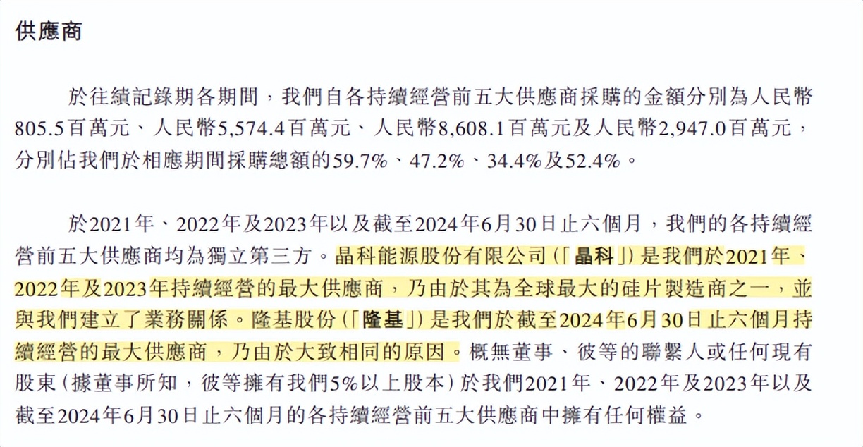 **在此背景下,鈞達股份面臨來自眾多同行的激烈競爭,其市場競爭力面臨考驗。**鈞達股份最大供應商與最大客户存在重合現象,2021年至2023年期間,晶科能源一直是其最大的供貨商和客户,而今年上半年,這一位置則被隆基股份所取代。鈞達股份還在招股書中表示,其客户在某種程度上也與其構成競爭關係。