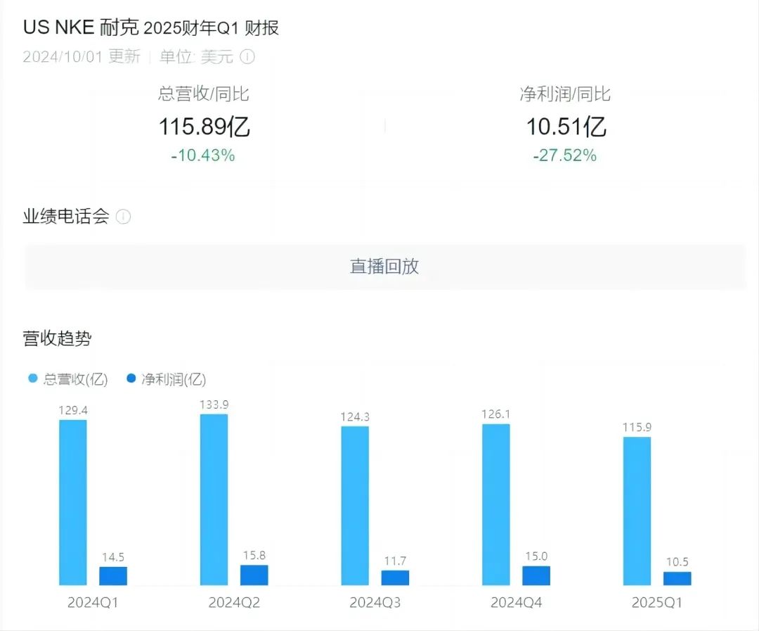 不久之前,耐克發佈了2025財年第一季度財務數據:在全球市場,耐克營收不及預期,收入115.9億美元,同比下跌10.4%;利潤10.5億美元,同比下跌27.6%。而就在今年上半年,耐克剛剛交出了史上最差的一份增長財報(剔除疫情影響):2024財年(2023年6月1日~2024年5月31日),耐克營收514億美元,同比增長不到1%。