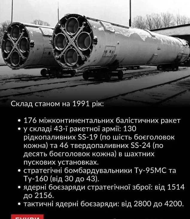 蘇聯解體之後,烏克蘭繼承了176枚洲際導彈,1240枚核彈頭;42架戰略轟炸機,可攜帶336枚核彈頭;還有數百件戰術核武器,成為了全球第三大核武庫。