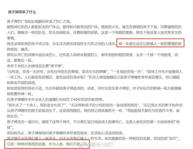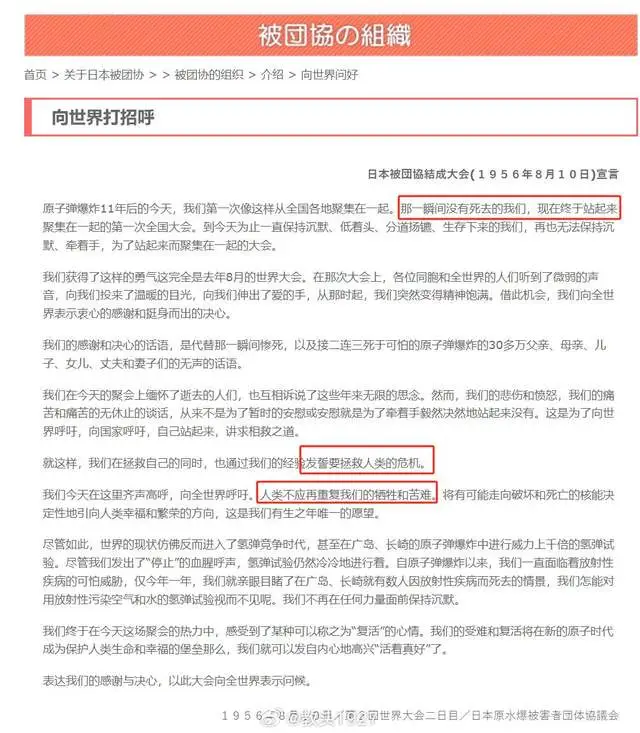 而到了“日本核彈協”這裏,我覺得這句話應該反過來説:“先説‘為什麼’,再談‘是不是’”。“日本核彈協”裏的核爆倖存者是不是捱了原子彈的炸?是,但是他們為什麼會挨原子彈炸?關於這個問題,“日本核彈協”一直以來要麼是諱莫如深,要麼就是顧左言他。只和世界人強調自己被原子彈炸了有多慘,卻不願或不敢説明他們和日本這個國家為什麼會挨原子彈的炸。