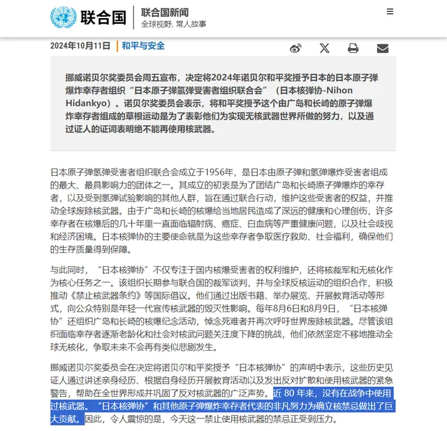 挪威諾貝爾獎委員會説:“80 年來,人類沒有在戰爭中再使用過核武器。‘日本核彈協’和其他原子彈爆炸倖存者代表的非凡努力,為確立此類核禁忌作出了巨大貢獻。”可問題是,人類在二戰後之所以再也沒有使用過核武器,這和“日本核彈協”有啥關係嗎?它們到底做出過什麼“非凡努力”和“巨大貢獻”了?再大還能大得過解放軍火箭軍上個月往南太平洋打的那枚洲際導彈嗎?