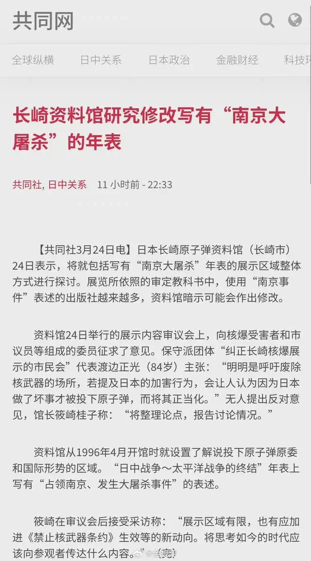 為什麼?你説這些人的心裏是沒有數嗎?不是的。2021年3月,日本共同社曾經刊登過一篇報道:日本長崎原子彈資料館在當時舉行了一場“展示內容審議會”,在會上,保守派團體“糾正長崎核爆展示的市民會”的代表渡邊正光提出了一條在我看來簡直是可忍、孰不可忍的主張:修改長崎原子彈資料館內展示的“南京大屠殺”年表,改成在表述上相對中性的“南京事件”。此舉也符合這些年來日本教科書的編寫規則,很多日本學生在課本上學到的就是“南京事件”,而非“南京大屠殺”。