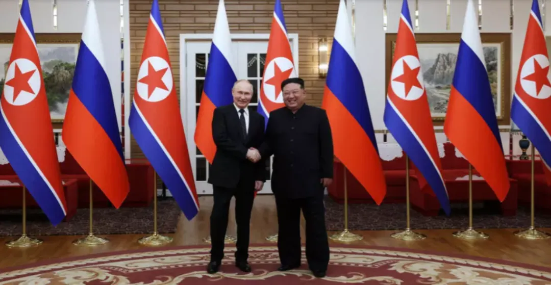 今年6月19日,俄羅斯總統普京與朝鮮勞動黨總書記、國務委員長金正恩在平壤簽署《全面戰略伙伴關係條約》****。條約規定,如果一方受到某一國或數國的武力攻擊、並處於戰爭狀態,則根據《聯合國憲章》第51條以及朝俄之間的法律,另一方將立即以一切可用手段提供軍事援助。(圖源:路透)