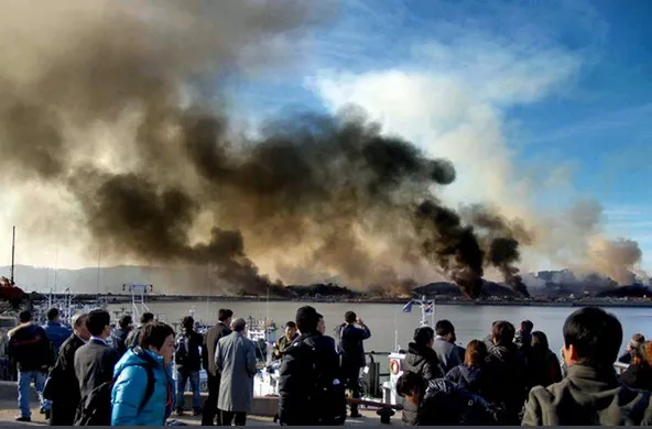 2010年11月23日韓國稱西部海域延坪島附近遭到朝鮮炮擊,韓國西部延坪島上硝煙滾滾。(圖源:韓國《中央日報》)