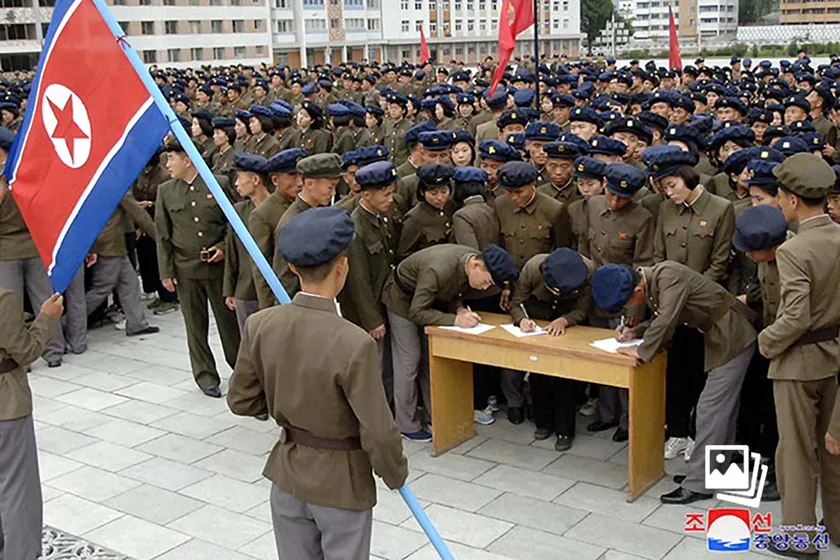 據朝中社16日報道,朝鮮方面稱,由於韓國對朝鮮的“重大主權侵犯挑釁行為”,14日至15日兩天,朝鮮全國有140多萬名青年同盟幹部和青年學生報名參軍或復隊(返回軍隊)。(圖源:朝中社)