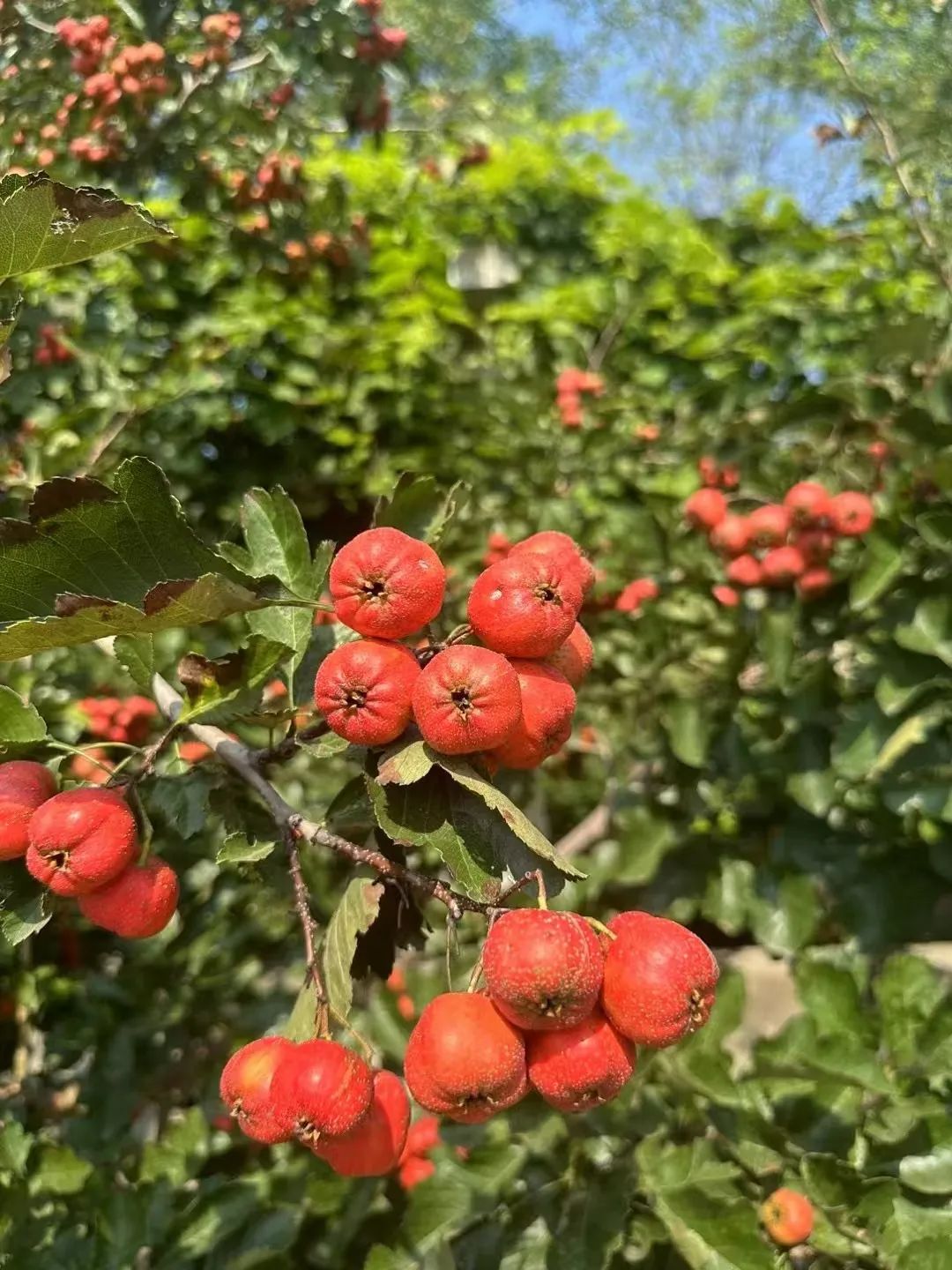 樹上的山楂已經紅透了,因為結果太多,樹枝已經明顯不堪重負。