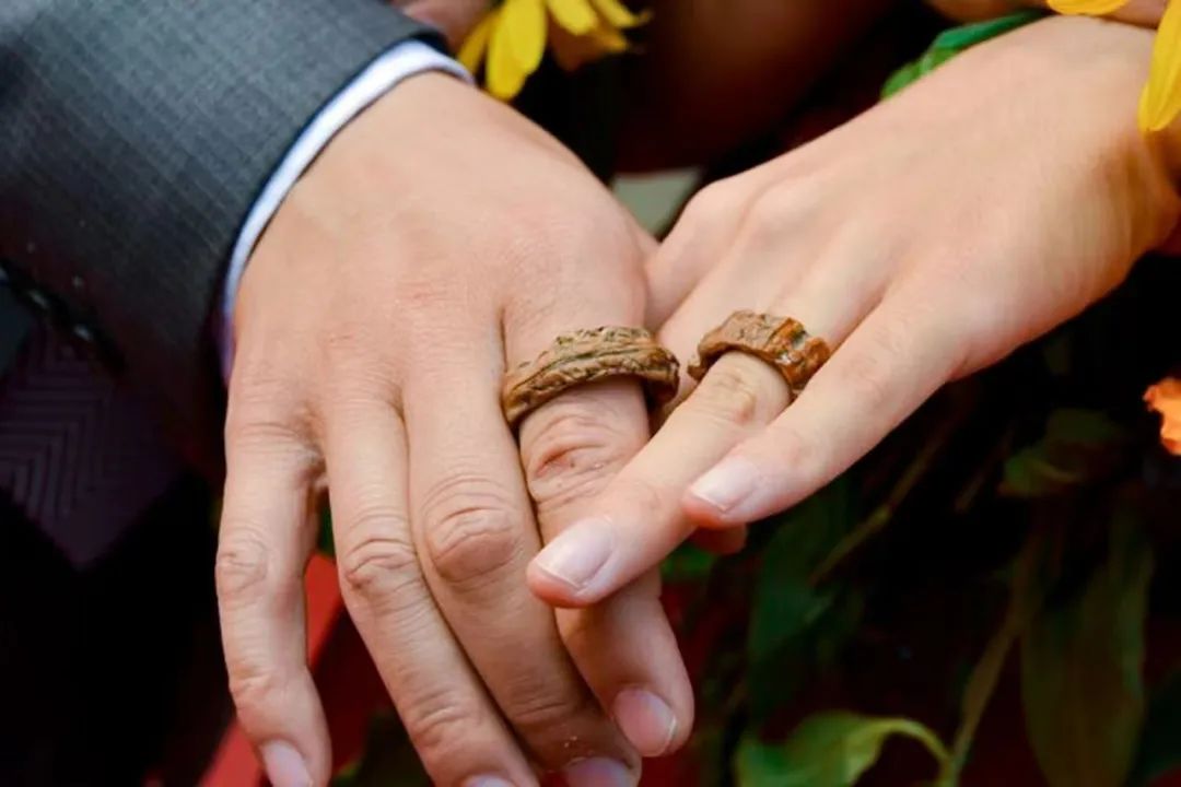 婚戒非金非銀,是村裏老師傅用核桃做成的,不值錢,卻獨一無二。