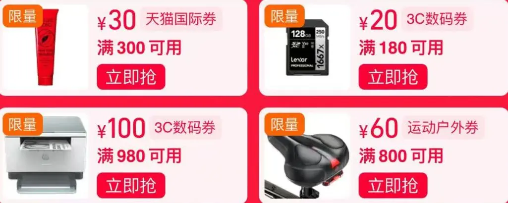 淘天則在3C、家電品類等京東優勢項目上,發放滿980元減100元的“3C數碼券”、滿2980元減300元和滿5980元減600元的“家電超值券”等多個檔位優惠。
