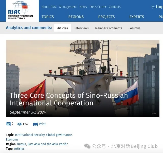 趙華勝在俄羅斯國際事務委員會發表題為"Three Core Concepts of Sino-Russian International Cooperation"的文章(圖源:俄羅斯國際事務委員會網站)