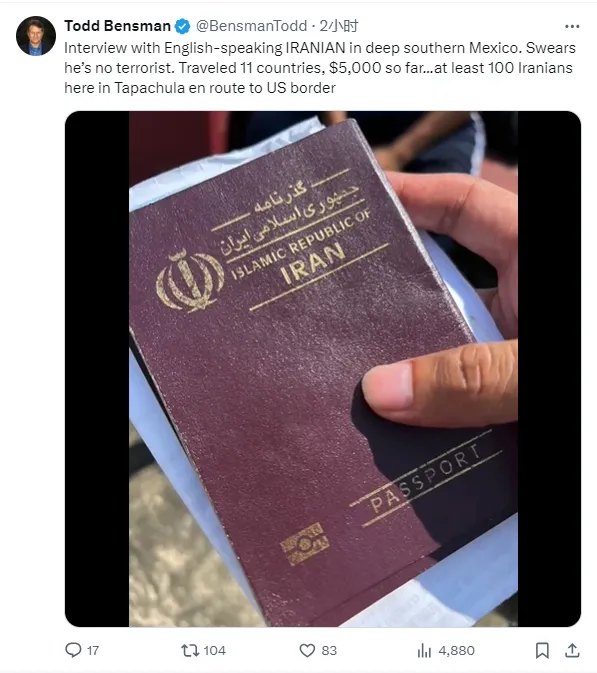 本斯曼在墨西哥南部採訪了一名説英語的伊朗人。這名男子發誓自己不是恐怖分子,他已經遊歷了 11 個國家,迄今花費了 5,000 美元……他説至少有 100 名伊朗人正在塔帕丘拉,準備前往美國邊境。