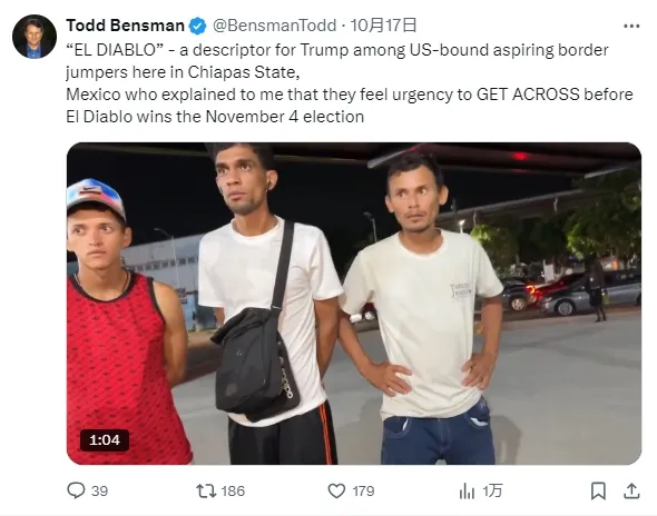 而更多的非法移民則在路上,本斯曼在墨西哥南部邊境恰帕斯州採訪的視頻顯示,這些正在趕路的非法移民稱川普為惡魔(EL DIABLO,西班牙語),他們迫切需要在11月4日之前趕到美國去。