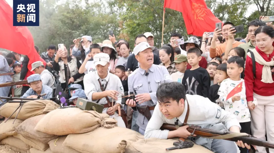 這是體驗中最核心的部分,遊客在團長的指揮下,手持道具武器,如大刀和手槍等,向着“縣城”進發,與“敵軍”展開“戰鬥”。