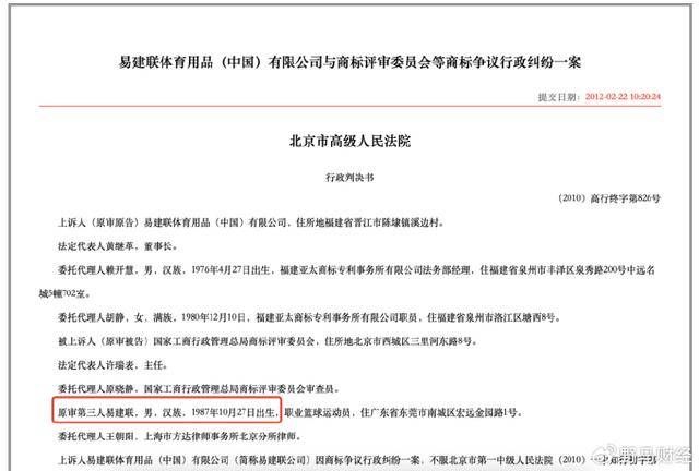 此外,北京法院網顯示,2012年公開的一起《易建聯體育用品 (中國)有限公司與商標評審委員會等商標爭議行政糾紛一案》中提到,易建聯,1987年10月27日出生,職業籃球運動員,住廣東省東莞市南城區宏遠金園路1號。該生日信息、地址信息與網絡照片同樣一致。