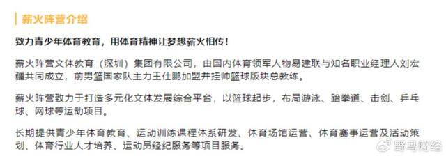 據“薪火陣營”公眾號介紹,公司致力於打造一個多元化的文體發展綜合平台,以籃球為起點,逐步擴展至游泳、跆拳道、擊劍、乒乓球、網球等多個運動項目。其業務涵蓋青少年體育教育、運動訓練課程研發、體育場館運營、體育賽事策劃與執行、體育人才培養以及運動員經紀服務,形成了全方位的體育服務體系。
