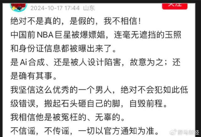 支持易建聯的網友認為,**“**照片是AI合成,還是被人設計陷害、故意為之?我堅信這麼優秀的一個男人,絕對不會犯如此低級錯誤,搬起石頭砸自己的腳,自毀前程。我相信他是被冤枉的、無辜的。不信謠,不傳謠,一切以官方通知為準。”