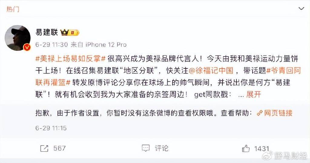 不過,正當他在資本市場如魚得水的時候,這場風波讓他的商業佈局陷入了困境。“疑似嫖娼”事件的爆發,讓代言公司“連夜刪除”易建聯的代言內容。