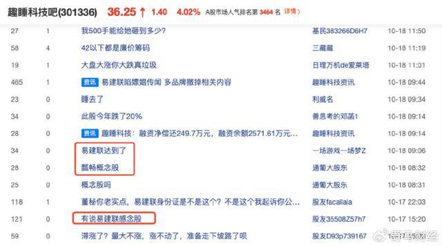 在趣睡科技的股吧中,也有**多位股民提到“易建聯”概念股。**對於易建聯傳聞,趣睡科技表示,“我們不清楚,不發表任何意見。”截至10月18日,趣睡科技收盤價為36.25元/股,總市值為14.5億元。